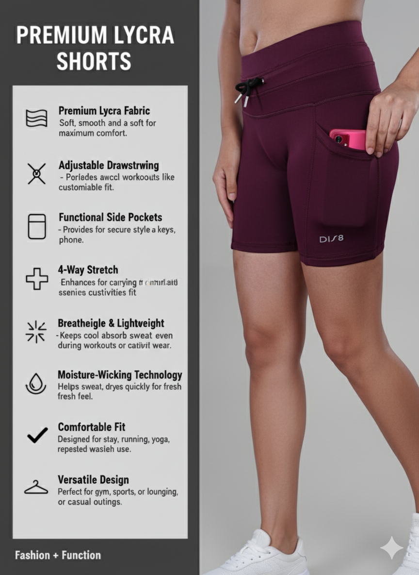 Crafted from premium 4-way stretch Lycra, these shorts deliver tummy control compression, breathability, and freedom of movement. The two functional side pockets add everyday convenience, allowing you to store essentials like your phone, keys, or gym card while staying hands-free during workouts.