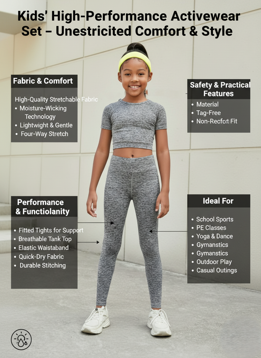 Keep your little athlete stylish, comfortable, and ready for action with our girls’ sports tank top and tights set. Designed for active kids, this coordinated outfit is perfect for sports, gymnastics, dance, yoga, and outdoor play.