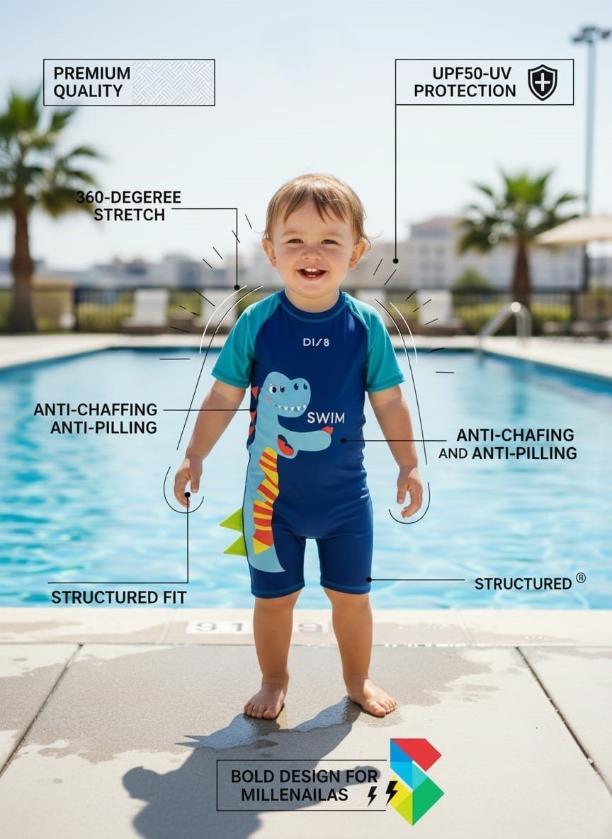 Perfect for swimming lessons, beach days, pool parties, water parks, or even as a fun costume, this kids’ dinosaur swimsuit combines playful design with practical performance.