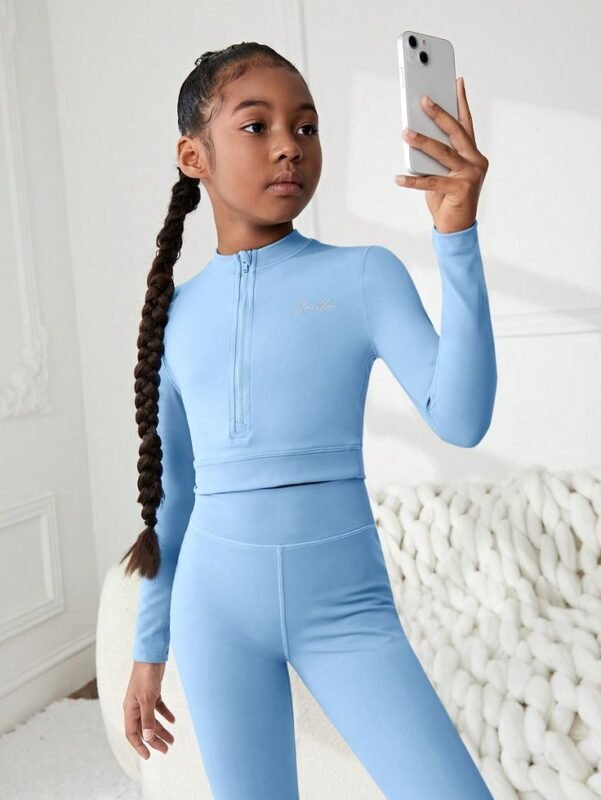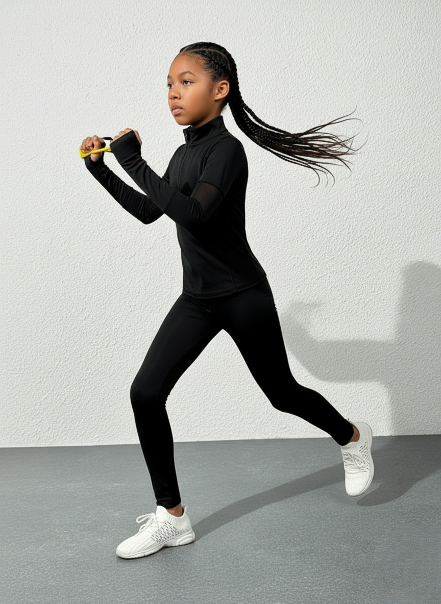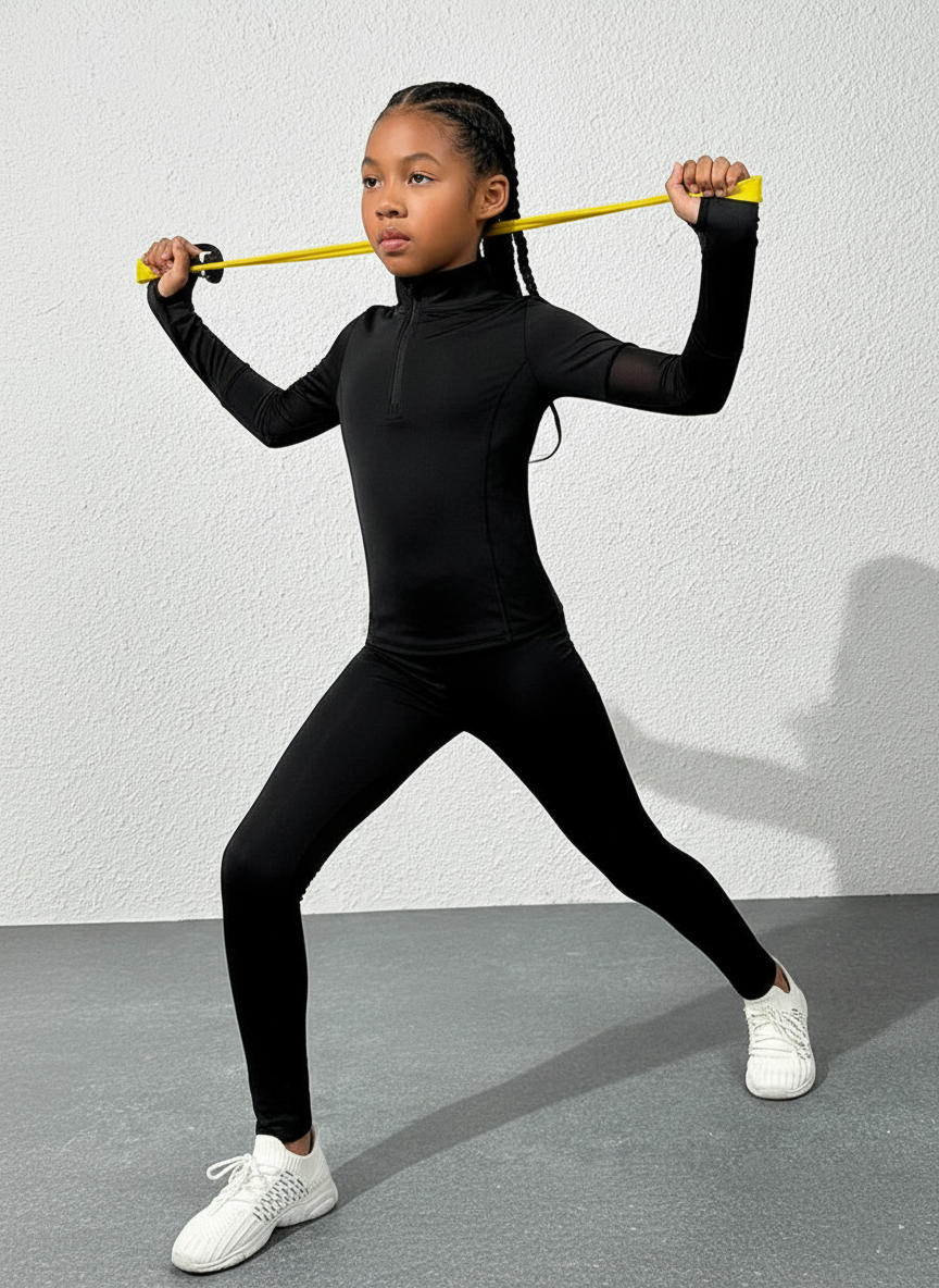 Empower your little athlete with our Kids Training Suit, a stylish and functional girls’ activewear set designed for sports, training, gymnastics, dance, yoga, and outdoor activities. This coordinated set includes a long-sleeve top with thumb holes and matching stretchable tights, ensuring both comfort and performance during every move.
