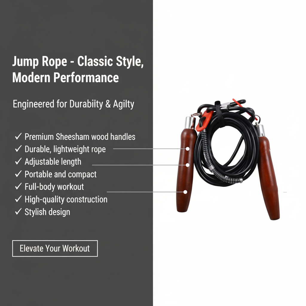 Shop Sheesham skipping rope for exercise and cardio. Durable wooden handles, adjustable tangle-free rope – ideal for home workouts, HIIT, CrossFit, and kids’ fitness.